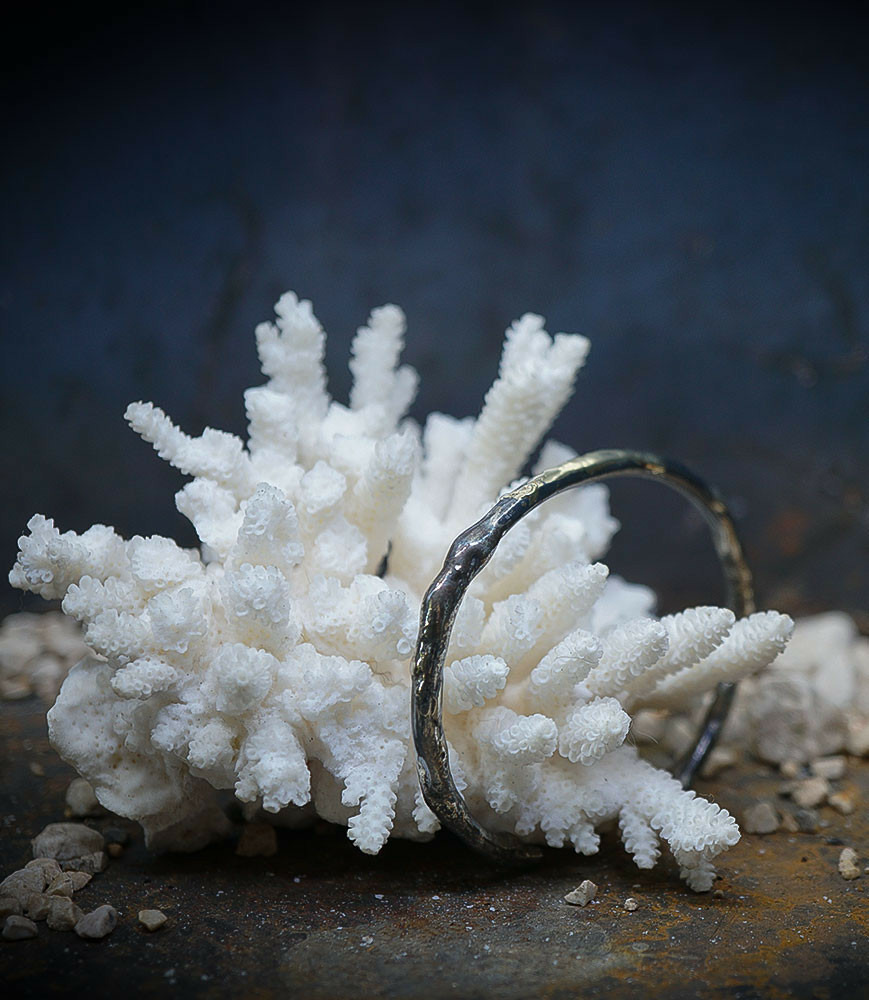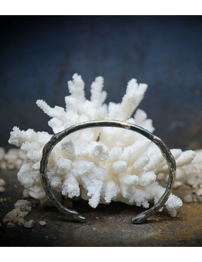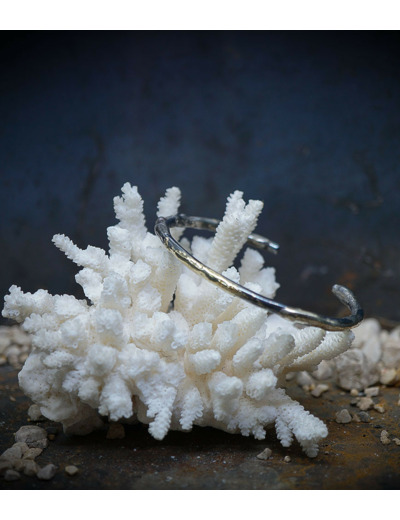 Ses bijoux, souvent réalisés en argent, mettent en avant des textures contrastées, avec des finitions lisses et martelées, évoquant un parfait équilibre entre force et finesse.