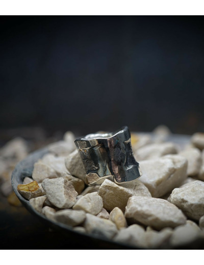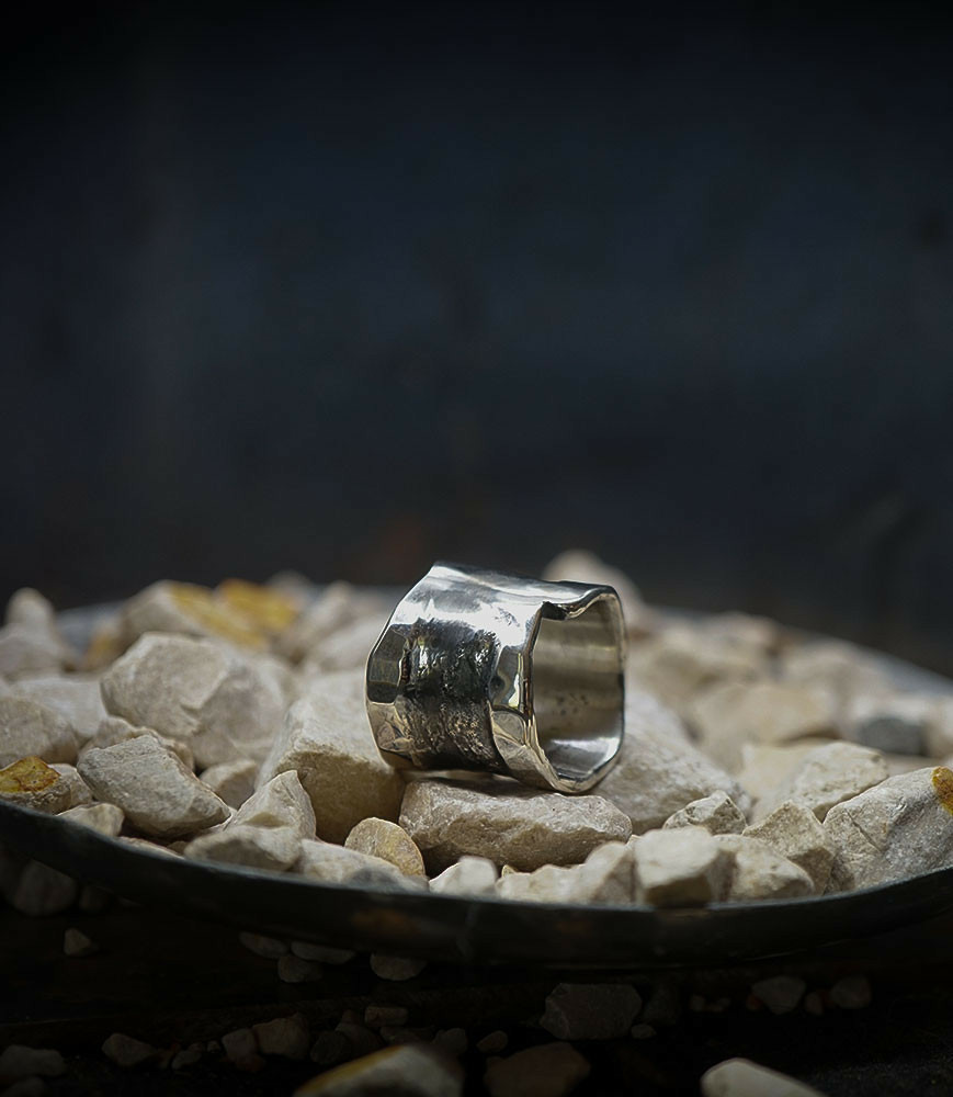 Valentine pour cette collection de bagues utilise une seule pièce d'argent au titre légal 925/1000 par création, qu'elle associe parfois à de la "côte de maille" en argent 925/1000. elle peut aussi sertir des pierres fines ou précieuses sur certaines pièces, en repliant simplement les bords de la bague sur le minéral.