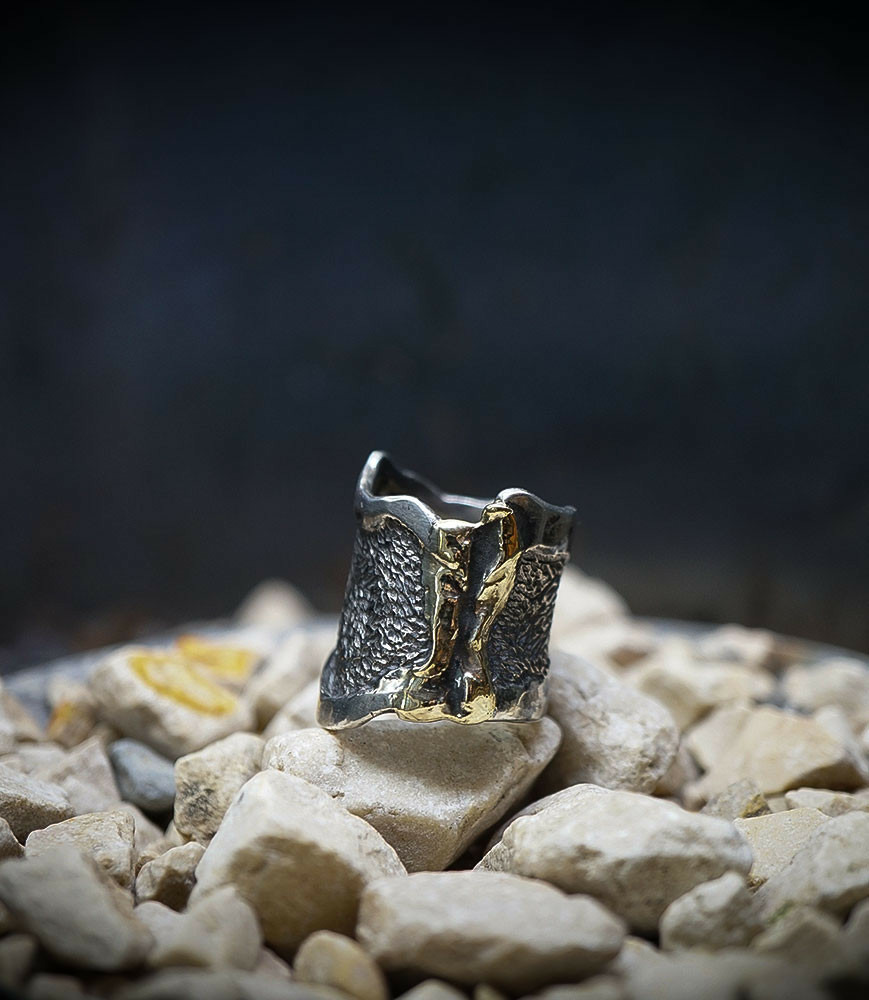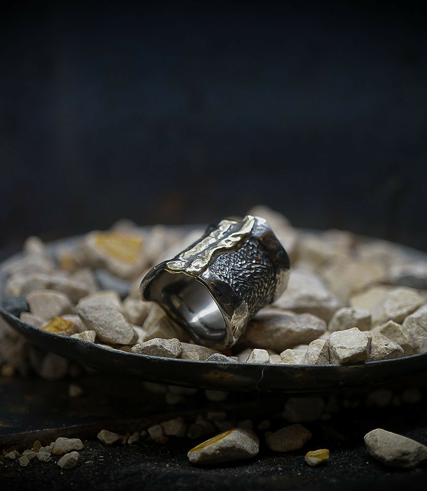 Valentine pour cette collection de bagues utilise une seule pièce d'argent au titre légal 925/1000 par création, qu'elle associe parfois à de la "côte de maille" en argent 925/1000. elle peut aussi sertir des pierres fines ou précieuses sur certaines pièces, en repliant simplement les bords de la bague sur le minéral.