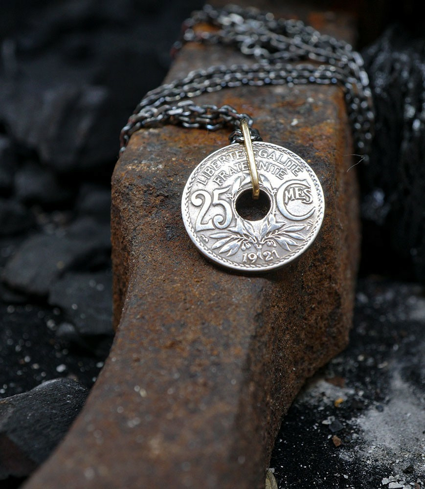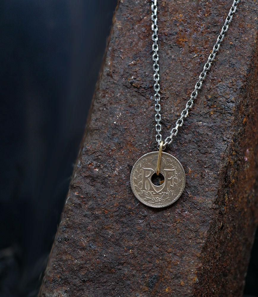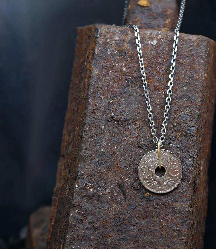Anthony Barrouyer pour cette collection de pendentif utilise une seule pièce d'argent au titre légal 925/1000 par création, qu'il associe parfois. Il peut aussi sertir des pierres fines ou précieuses sur certaines pièces.