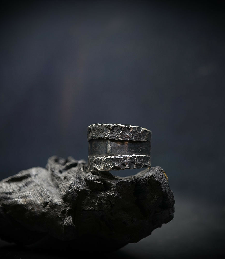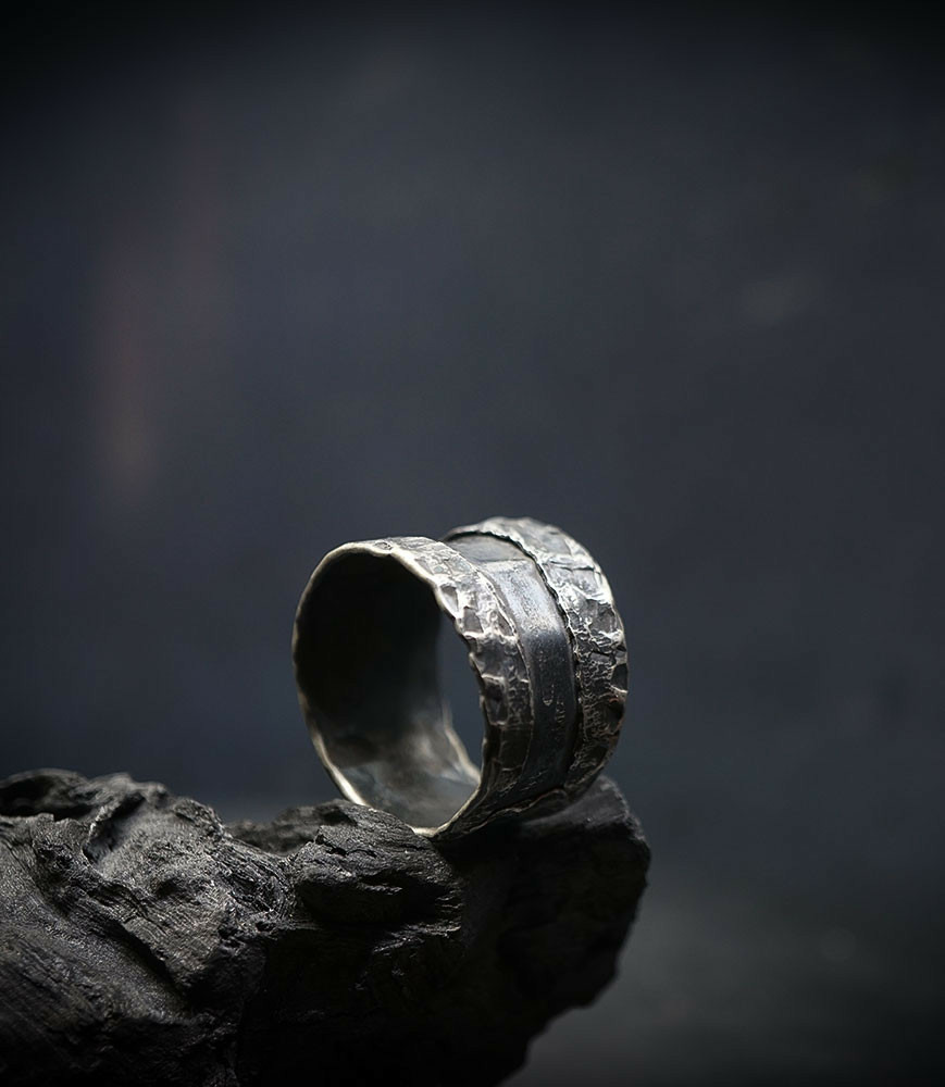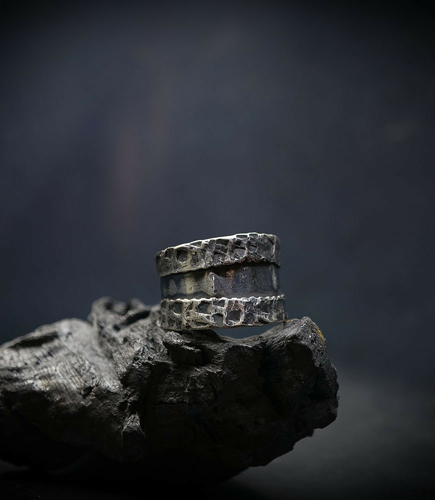Anthony pour cette collection de bagues utilise une seule pièce d'argent au titre légal 925/1000 par création, qu'il associe parfois à de la "côte de maille" en argent 925/1000. Il peut aussi sertir des pierres fines ou précieuses sur certaines pièces, en repliant simplement les bords de la bague sur le minéral.