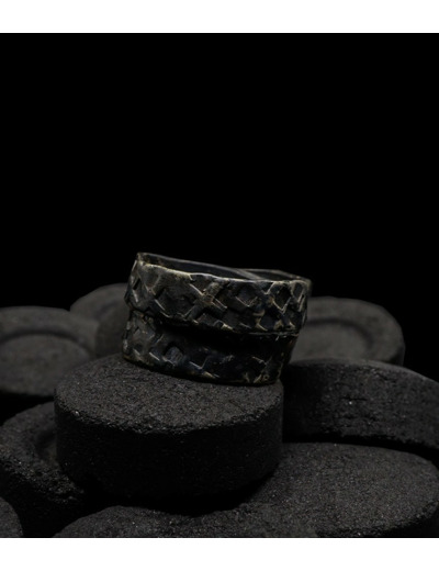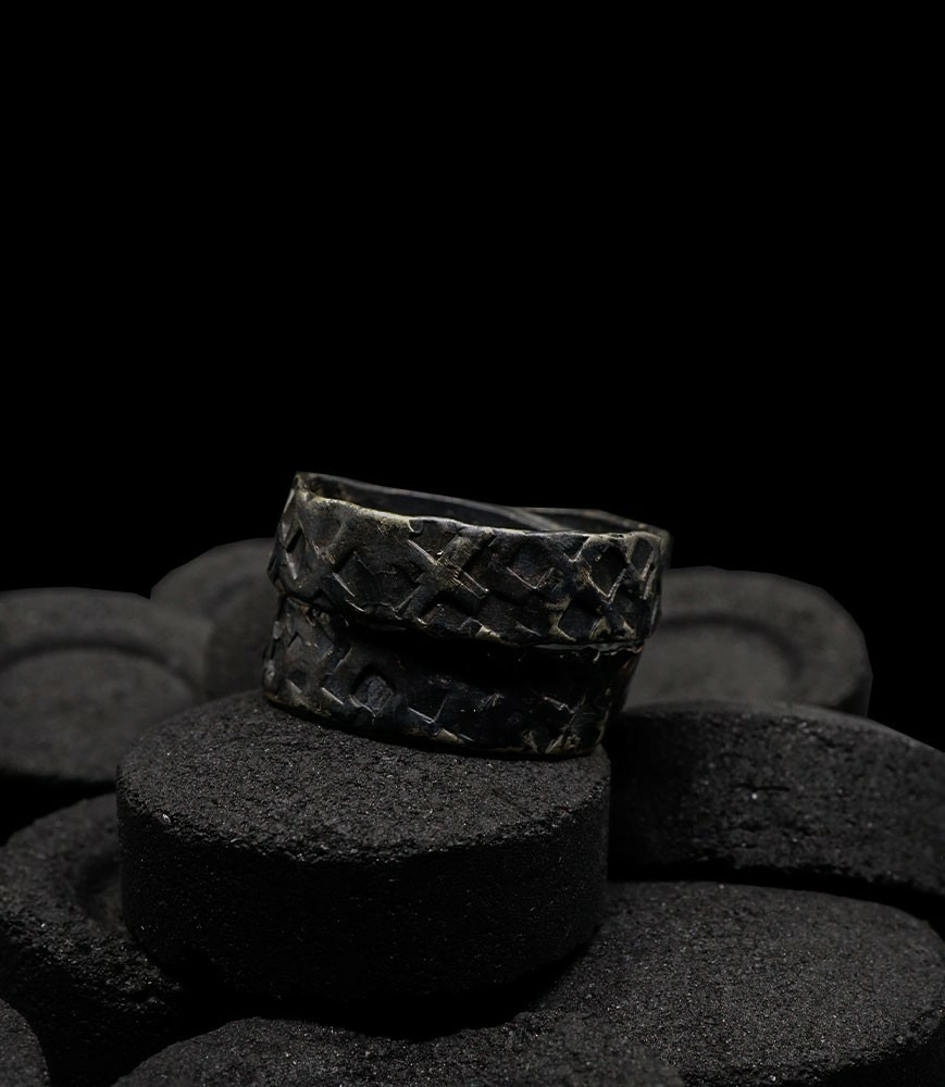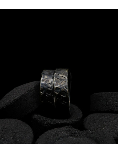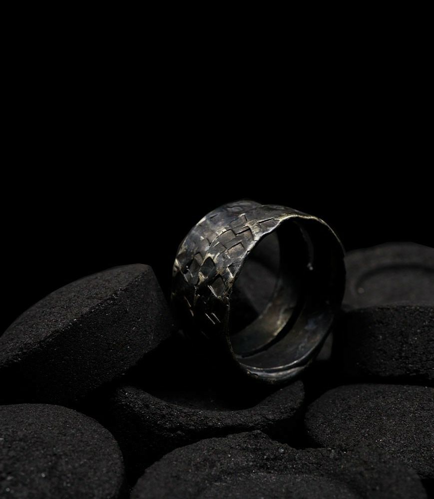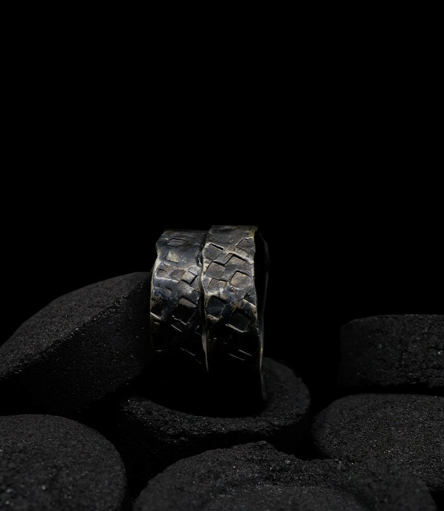 Anthony pour cette collection de bagues utilise une seule pièce d'argent au titre légal 925/1000 par création, qu'il associe parfois à de la "côte de maille" en argent 925/1000. Il peut aussi sertir des pierres fines ou précieuses sur certaines pièces, en repliant simplement les bords de la bague sur le minéral.