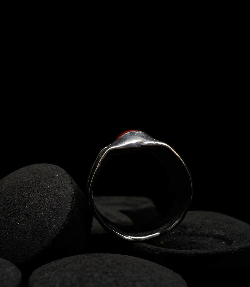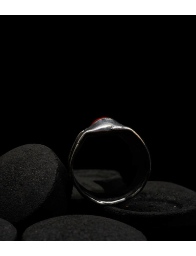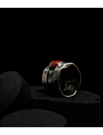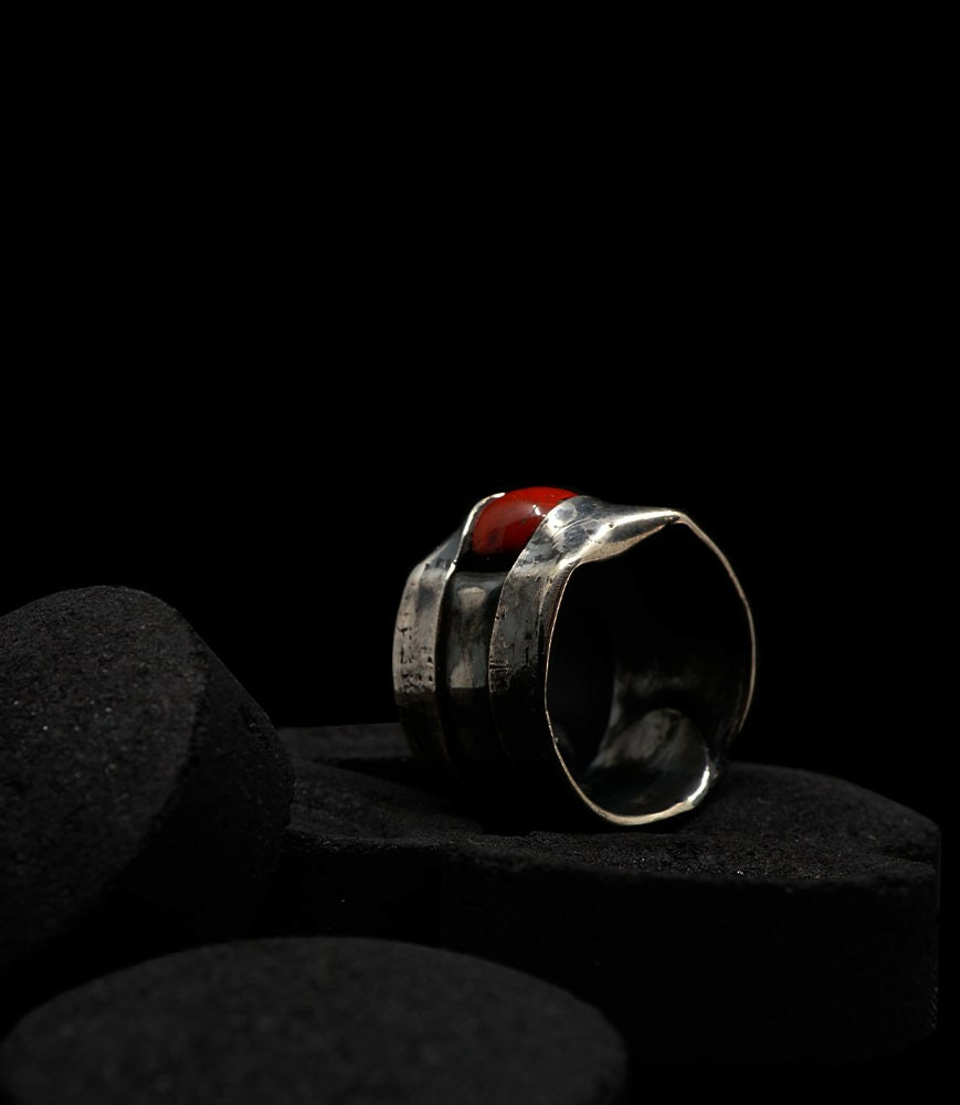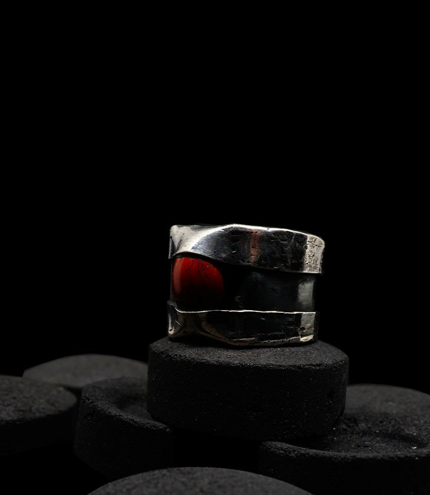 Anthony pour cette collection de bagues utilise une seule pièce d'argent au titre légal 925/1000 par création, qu'il associe parfois à de la "côte de maille" en argent 925/1000. Il peut aussi sertir des pierres fines ou précieuses sur certaines pièces, en repliant simplement les bords de la bague sur le minéral.