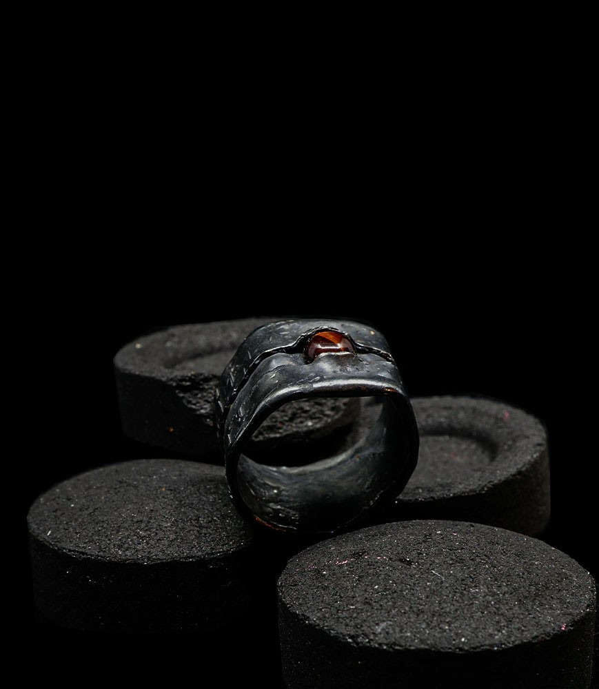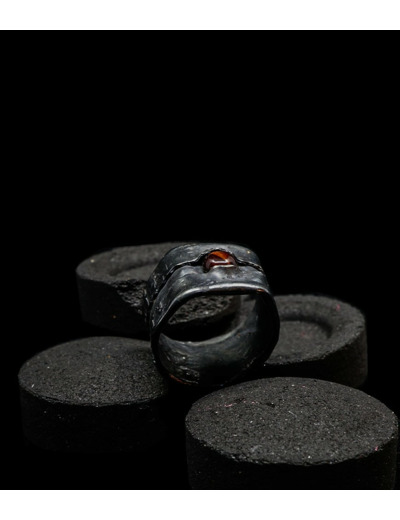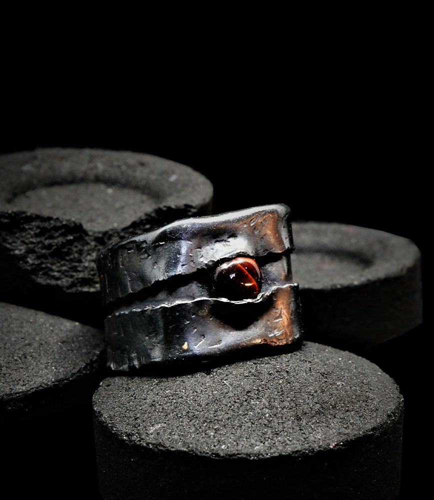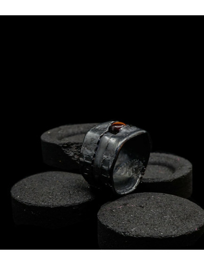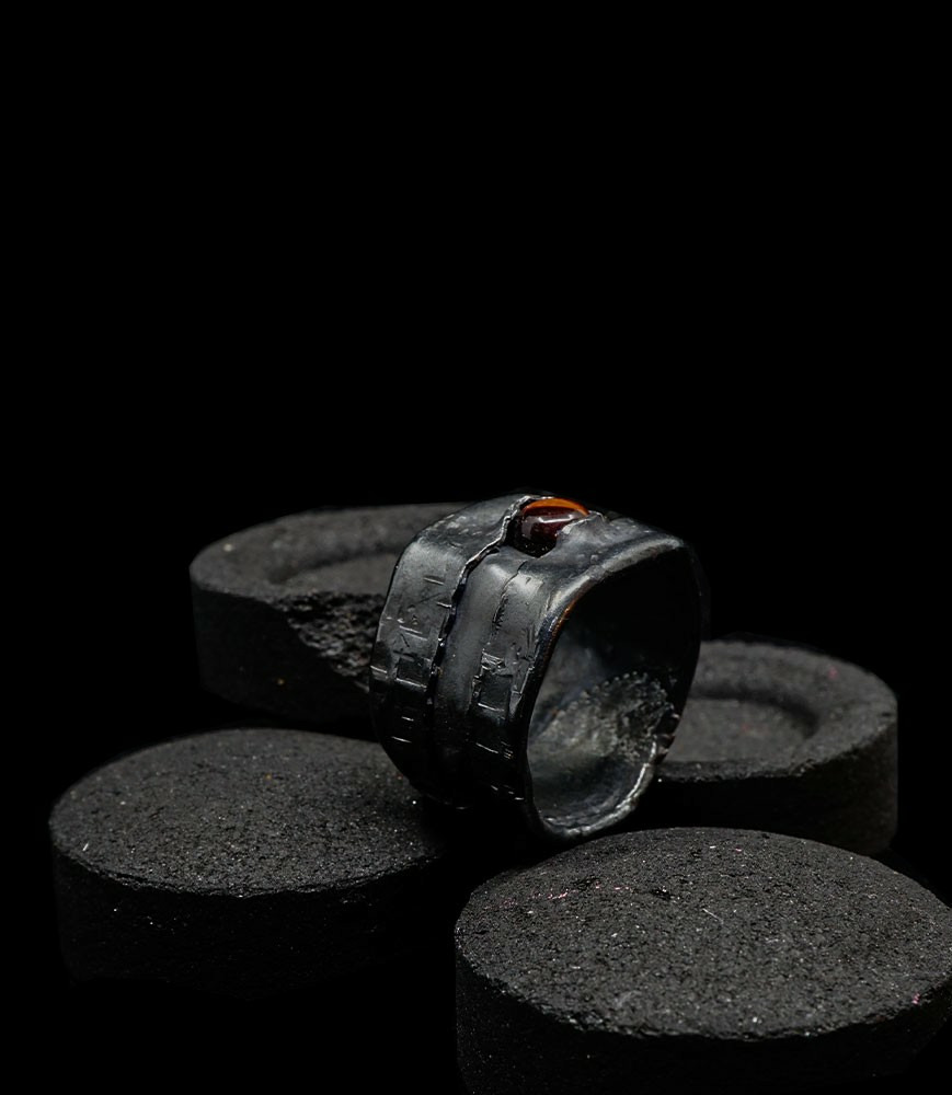 Anthony pour cette collection de bagues utilise une seule pièce d'argent au titre légal 925/1000 par création, qu'il associe parfois à de la "côte de maille" en argent 925/1000. Il peut aussi sertir des pierres fines ou précieuses sur certaines pièces, en repliant simplement les bords de la bague sur le minéral.