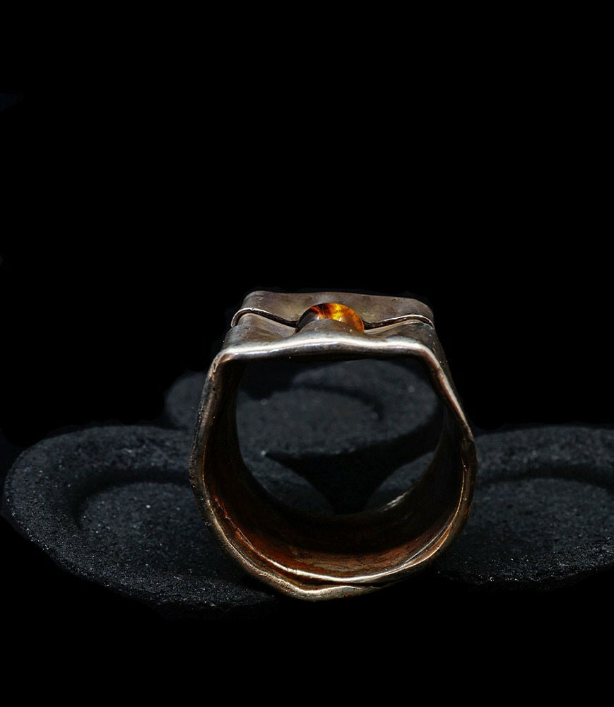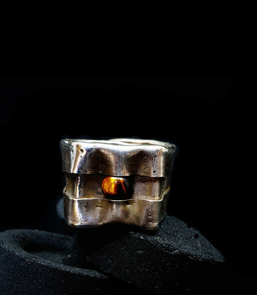 Anthony pour cette collection de bagues utilise une seule pièce d'argent au titre légal 925/1000 par création, qu'il associe parfois à de la "côte de maille" en argent 925/1000. Il peut aussi sertir des pierres fines ou précieuses sur certaines pièces, en repliant simplement les bords de la bague sur le minéral.