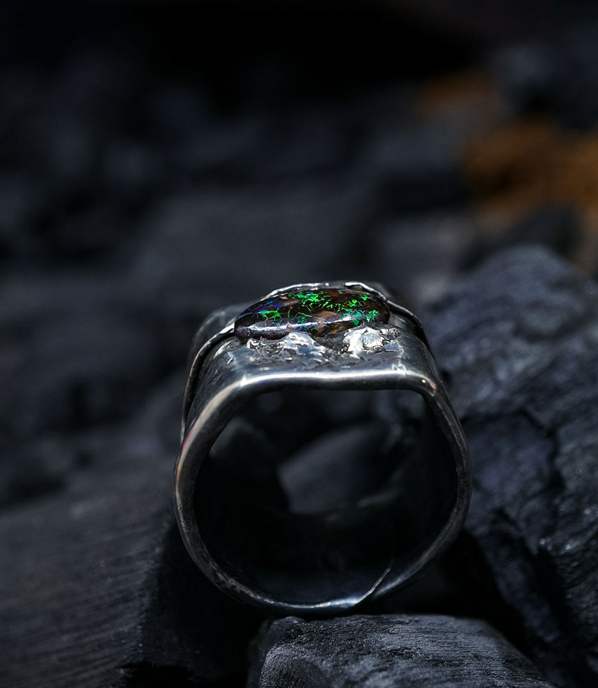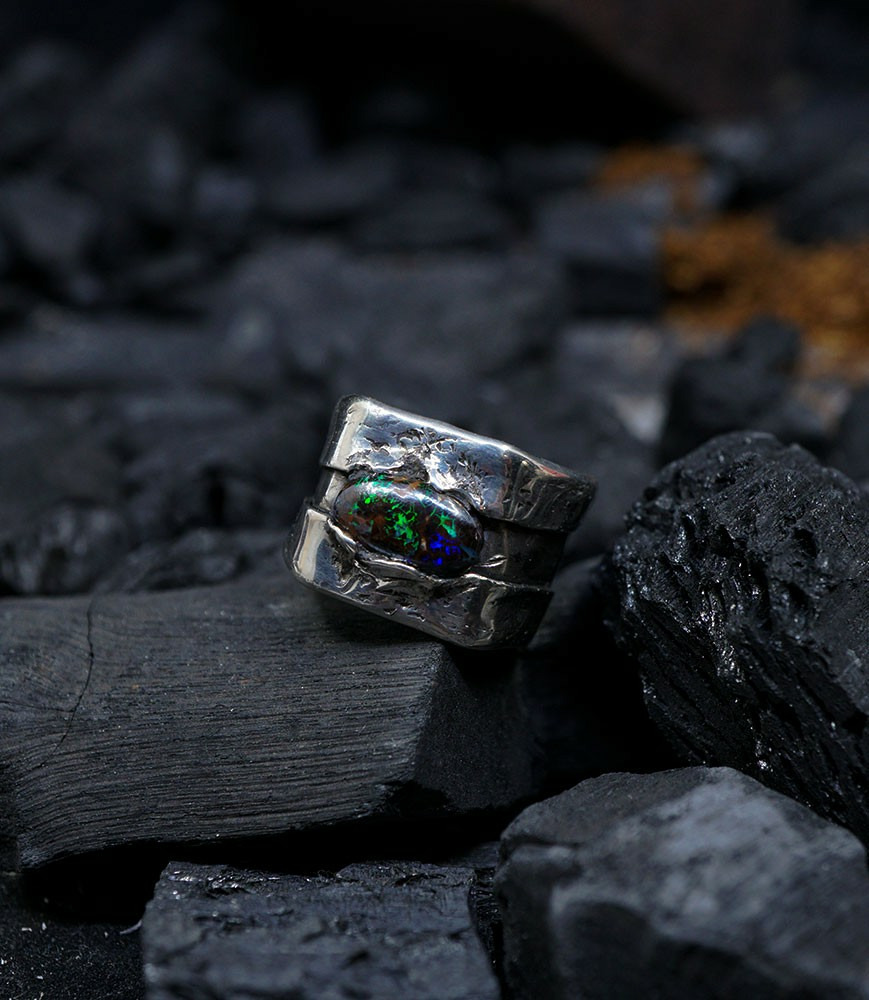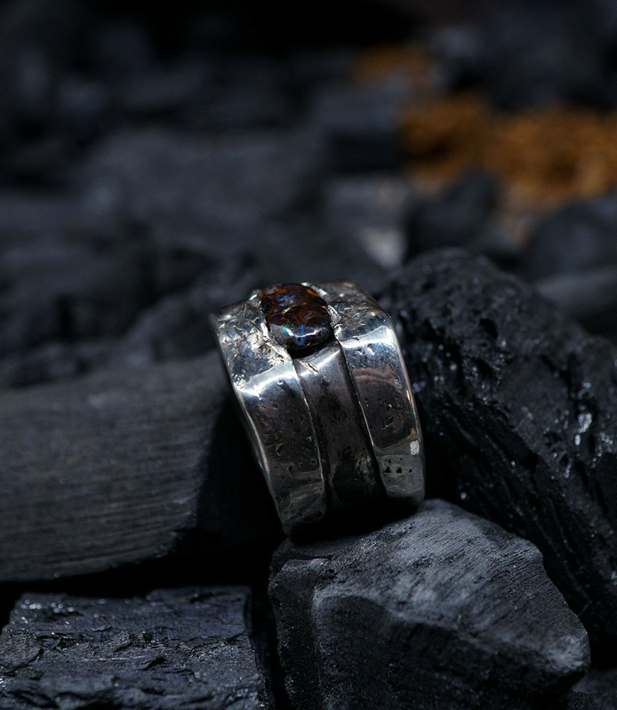 Anthony pour cette collection de bagues utilise une seule pièce d'argent au titre légal 925/1000 par création, qu'il associe parfois à de la "côte de maille" en argent 925/1000. Il peut aussi sertir des pierres fines ou précieuses sur certaines pièces, en repliant simplement les bords de la bague sur le minéral.