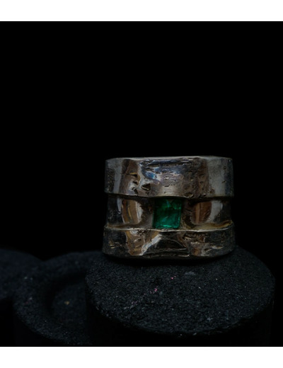 Anthony pour cette collection de bagues utilise une seule pièce d'argent au titre légal 925/1000 par création, qu'il associe parfois à de la "côte de maille" en argent 925/1000. Il peut aussi sertir des pierres fines ou précieuses sur certaines pièces, en repliant simplement les bords de la bague sur le minéral.