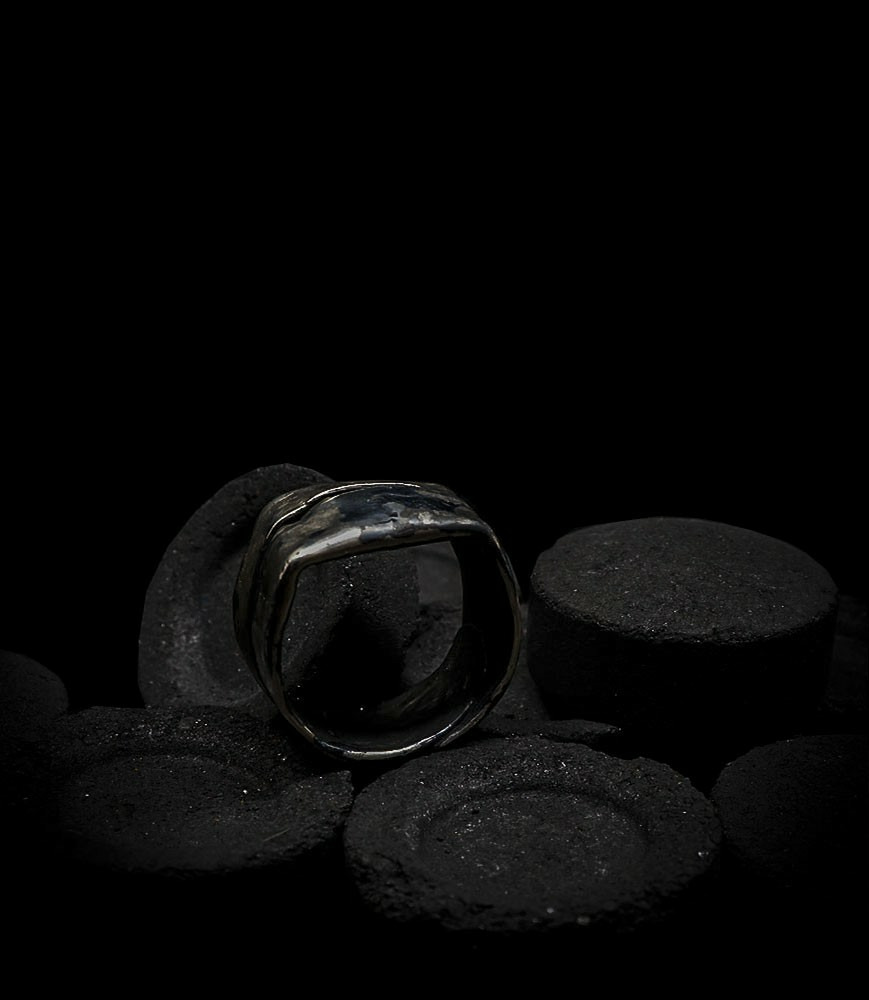 Anthony barrouyer pour cette collection de bagues krazy stones utilise une seule pièce d'argent massif au titre légal 925/1000 par création, qu'il associe parfois à de la "côte de maille" en argent 925/1000. Il peut aussi sertir des pierres fines ou précieuses sur certaines pièces, en repliant simplement les bords de la bague sur le minéral.