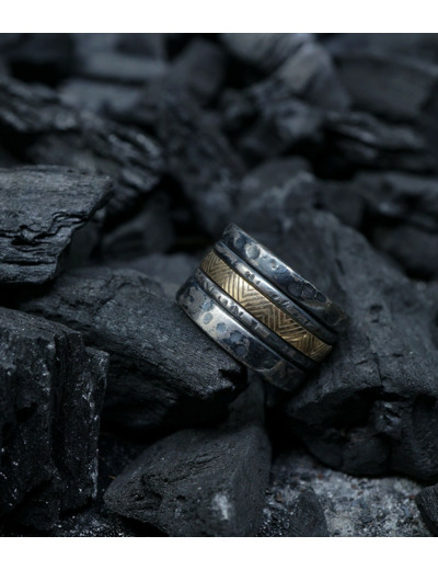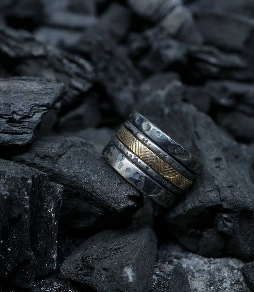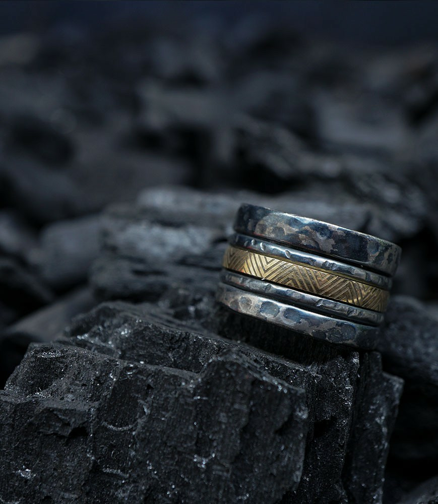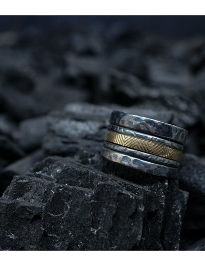 L'argent au titre légal 925/1000 subit un traitement brutal, chacune des pièces (krazy stones) est travaillées à la main, une par une, votre futur bijou forgé unique de par sa forme et ses effets.