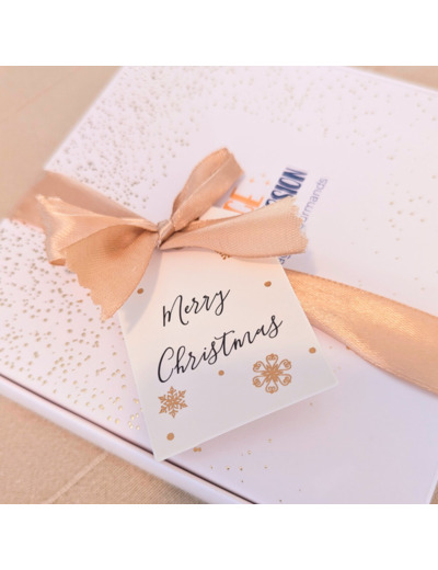 En tant que petite maison artisanale, nous voulons proposer un cadeau de Noël qui coche toutes les cases : de jolies bouchées de chocolats, une présentation premium et du plaisir garanti. Ce coffret chocolat associe le savoir-faire de maison de chocolaterie Valrhona à une mise en scène soignée : boîte blanche et dorée, ruban doré, étiquette “Merry Christmas” à personnaliser par vous (nous fournissons l’étiquette, vous écrivez votre message).