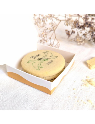 Si la boîte de dragées personnalisée reste un classique du baptême ou de la communion, cette version revisitée avec des biscuits sablés artisanaux offre une alternative résolument moderne et tendance. Présentée dans une boîte blanche et couleur biscuit, elle s’intègre facilement à toutes les décorations de table et thèmes de cérémonie.