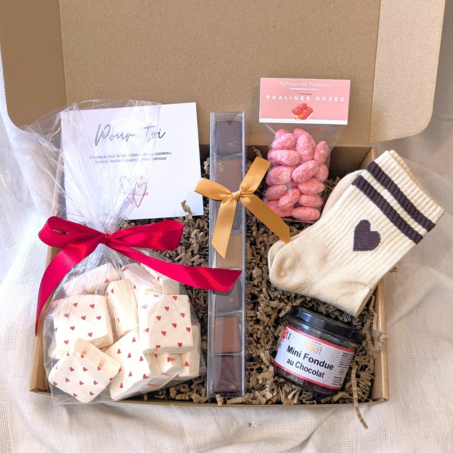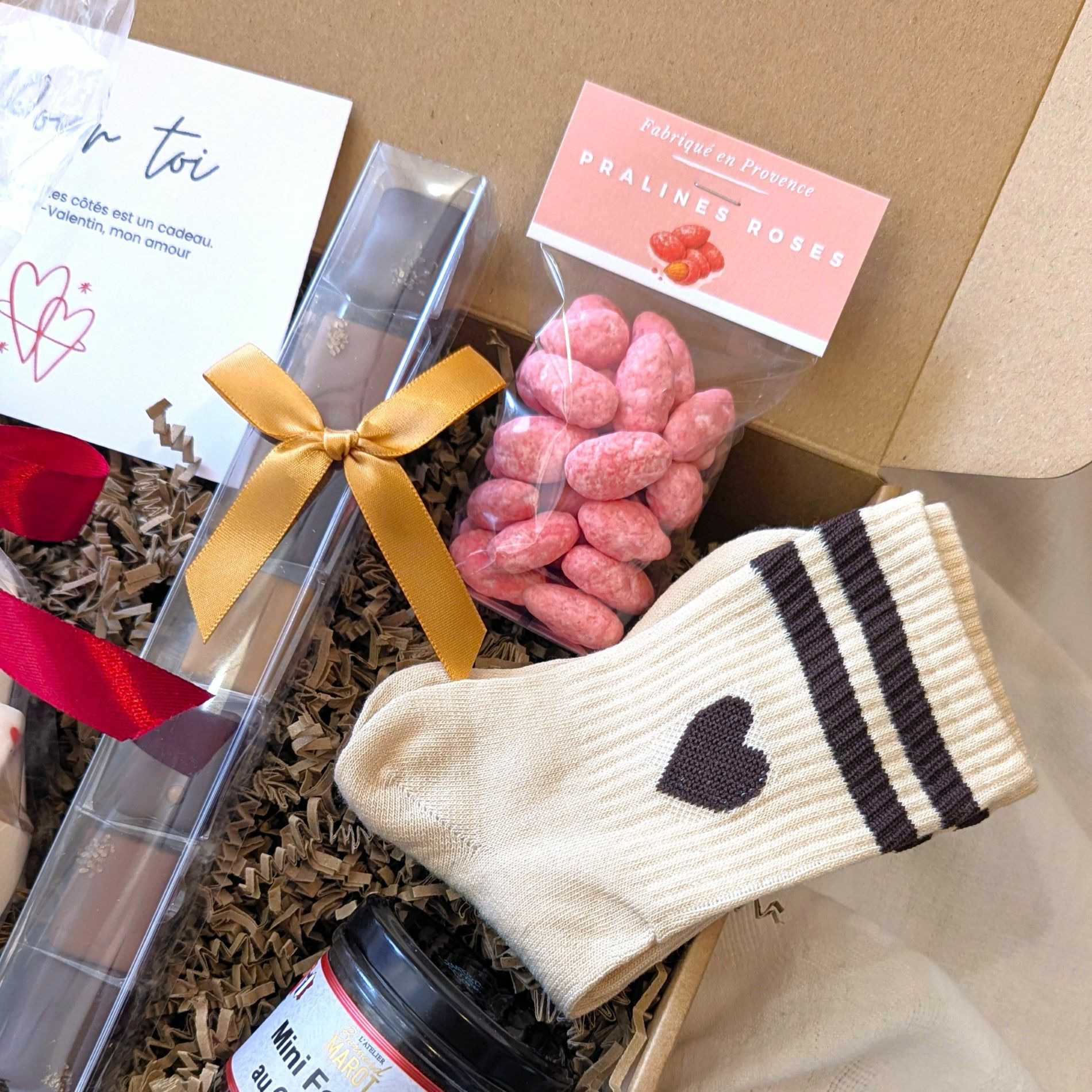 Pour compléter cette box cadeau couple, un sachet de pralines roses de Provence a été ajouté.