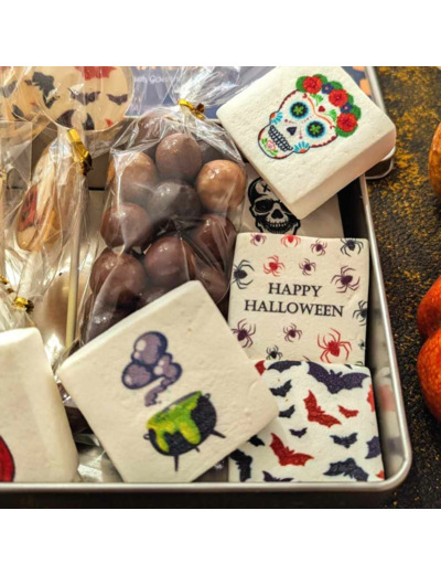 Préparez-vous à célébrer Halloween avec une box gourmande qui ravira petits et grands ! Cette box est composée de 6 biscuits décorés Halloween, 6 guimauves personnalisées, 6 sucettes thématiques et 70g de croustillants au chocolat sans gluten.