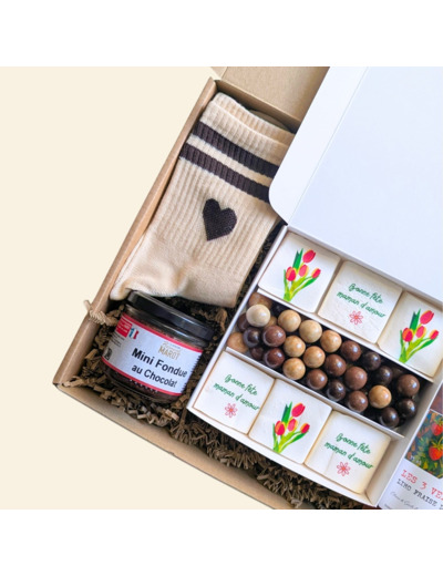 Présentée dans une grande boîte cartonnée avec un nœud imprimé, elle est prête à offrir sans avoir besoin de papier cadeau. À l’intérieur, un assortiment varié mêlant gourmandises, boisson artisanale et petite attention cocooning. Un coffret qui fait plaisir dès l’ouverture et qui accompagne votre maman dans un vrai moment pour elle.