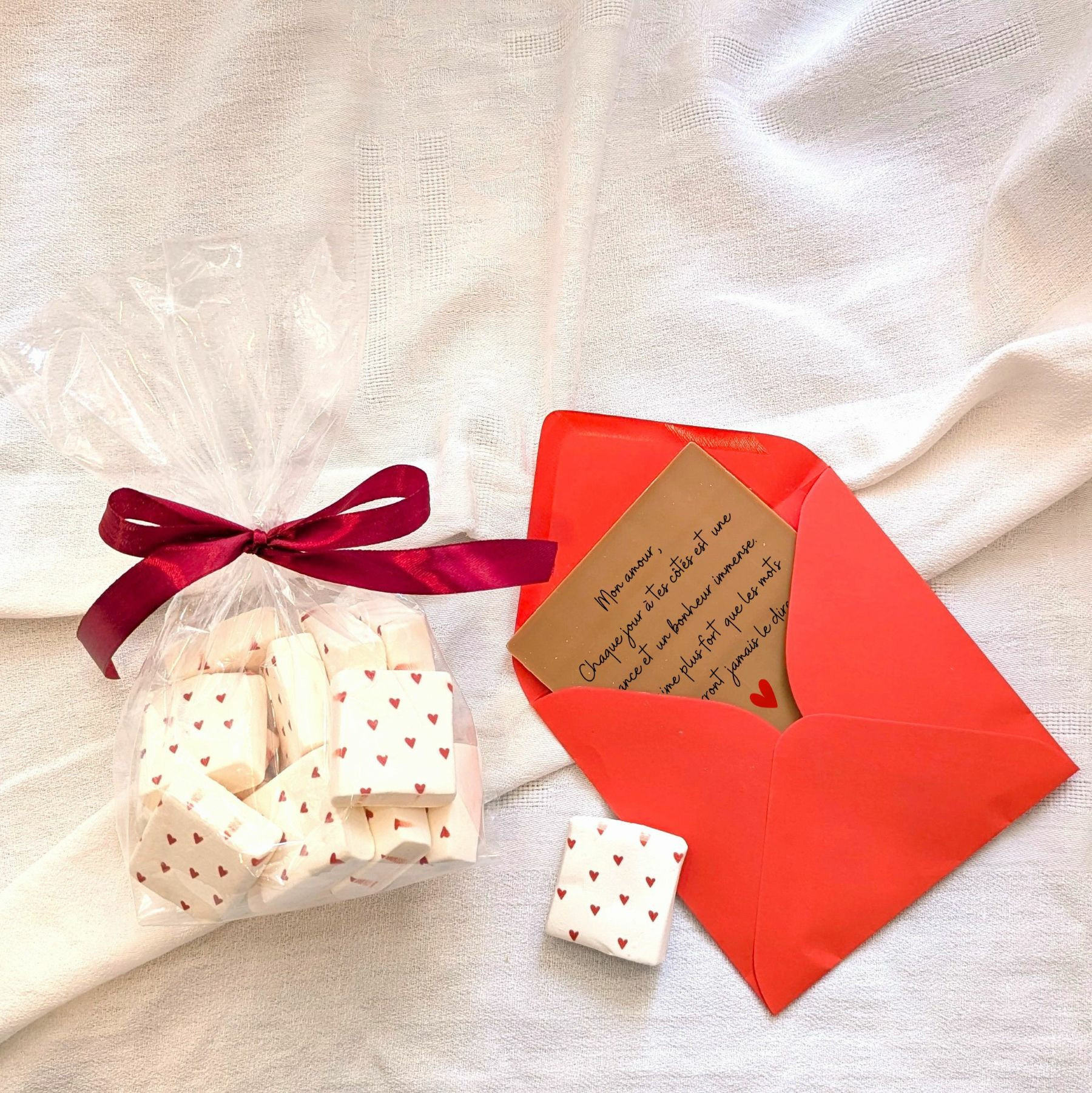 Ces guimauves complètent parfaitement la tablette de chocolat et apportent une note ludique et fondante à ce cadeau amoureux personnalisé.