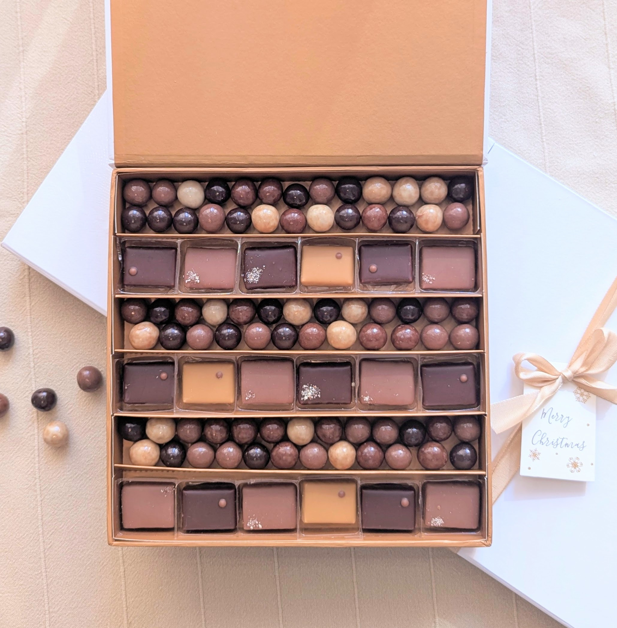 Idéal pour offrir à vos proches, amis ou collègues, ce coffret cadeau de Noël allie élégance visuelle et excellence gustative. Il trouvera sa place sous le sapin ou sur la table des fêtes pour une dégustation conviviale et mémorable. Si vous préférez un coffret composé de chocolats Valrhona uniquement, découvrez notre coffret gourmand de chocolats de Noël.