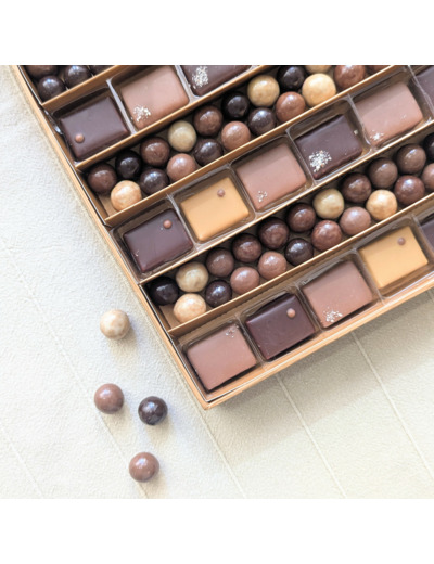 Contenance : 18 chocolats Valrhona + billes croustillantes sans gluten (~150 g)