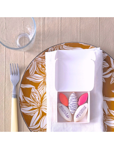 Pour un mariage champêtre plein de tendresse, cette petite boîte de calissons personnalisés au thème Lavande est l’attention parfaite. Elle renferme trois calissons imprimés avec vos prénoms, la date ou un mot doux, et existe également en version avec deux mini calissons fruités pour un assortiment plus varié.