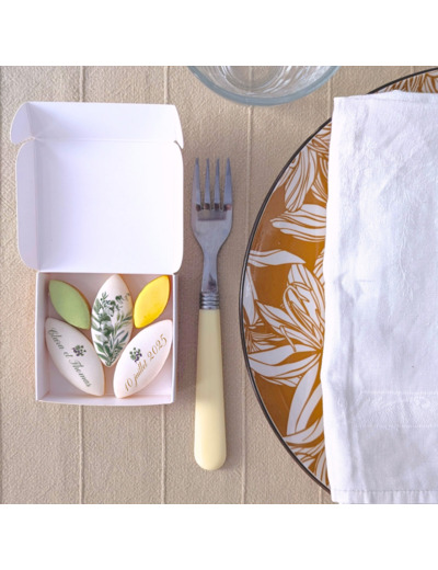 Disponible en deux formats, cette boîte contient 3 calissons personnalisés (prénoms, date, mot) ou 3 + 2 mini calissons fruités. L’ensemble est présenté dans une boîte blanche , parfaite pour une présentation sobre, élégante et naturelle.