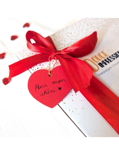 Présentation : coffret blanc avec détails dorés, ruban rouge satiné, étiquette cœur vierge