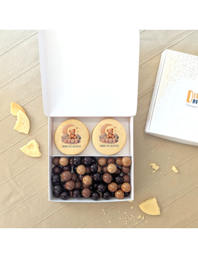 Ce coffret associe 6 biscuits sablés pur beurre fabriqués artisanalement en Provence et imprimés avec votre image, photo, logo ou message personnel, à 120 g de croustillants au chocolat sans gluten, irrésistibles et fondants.
