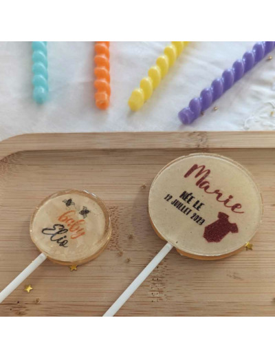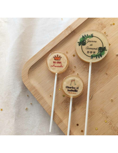 Nos grandes sucettes en vrac font 5 cm de diamètre, elles sont disponibles à la fraise, au citron, à la coco ou à la pomme. Les arômes sont naturels et fabriqués dans le sud de la France 🌿Une fine feuille de sucre est glissée à l’intérieur avec votre personnalisation.