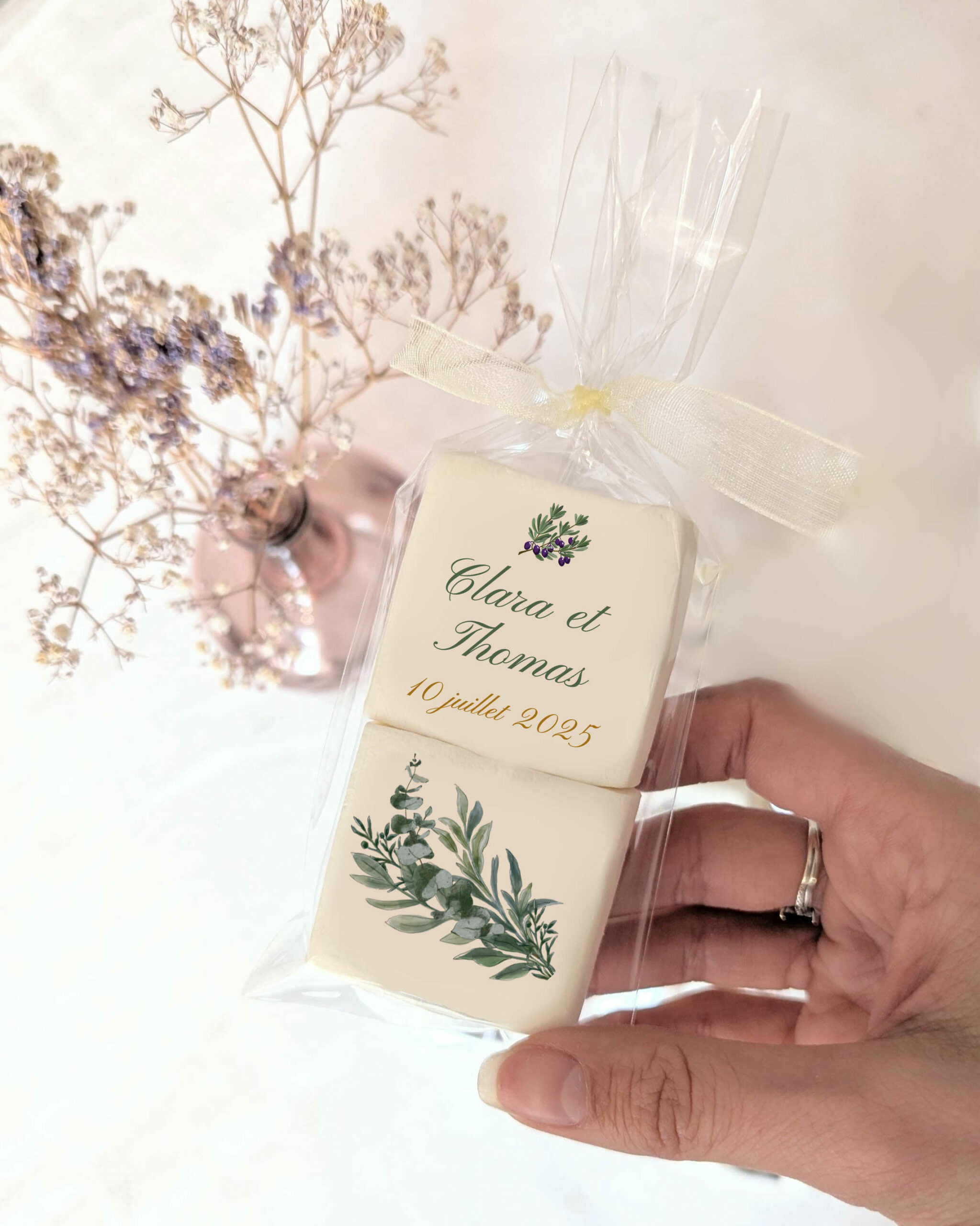 Peux importe le thème de votre mariage nous avons forcément un visuel qui correspond à vos envies de décoration. Découvrez nos cadeaux invités comestibles sur le thème provençal, ou notre collection mariage olivier. Nos guimauves personnalisées s’intègrent parfaitement dans une décoration élégante et tendance. Découvrez aussi nos calissons mariage.