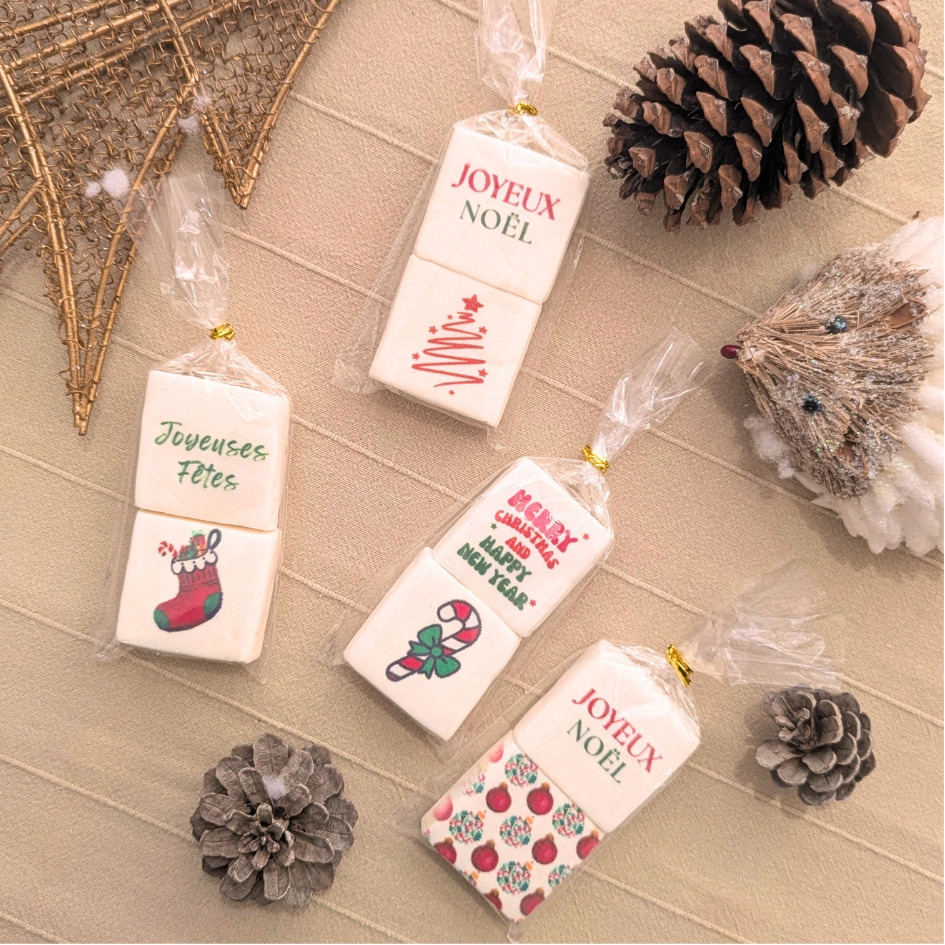 Pour un cadeau de Noël unique et gourmand, découvrez notre duo de guimauves personnalisées, parfait pour surprendre et ravir vos invités. Chaque sachet contient deux guimauves moelleuses décorées avec des motifs festifs : cannes à sucre, cadeaux, chapeaux de Père Noël, sapins, rennes et bien plus encore