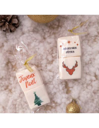 Ces guimauves personnalisées sont idéales pour décorer une table de fête, ajouter une note sucrée aux assiettes de vos convives, ou même comme petite attention à accrocher dans le sapin. Le format duo en sachet transparent en fait une idée cadeau de Noël pratique et originale, apportant une touche de gourmandise aux festivités.