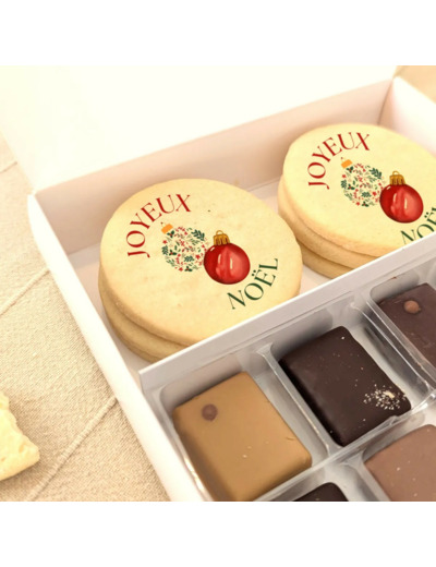 Le Charmant fait partie de nos cadeaux noel personnalisés : 6 biscuits sablés personnalisés + un assortiment de 8 chocolats Valrhona, présentés dans une boîte blanche aux reliefs dorés – élégante et prête à offrir. Une alternative au panier gourmand noel ou au panier garni noel, parfaite pour surprendre au pied du sapin.