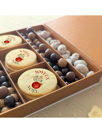 6 biscuits personnalisés + 110 g de croustillants chocolat + 160 g de Macao (amandes caramélisées)