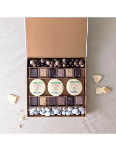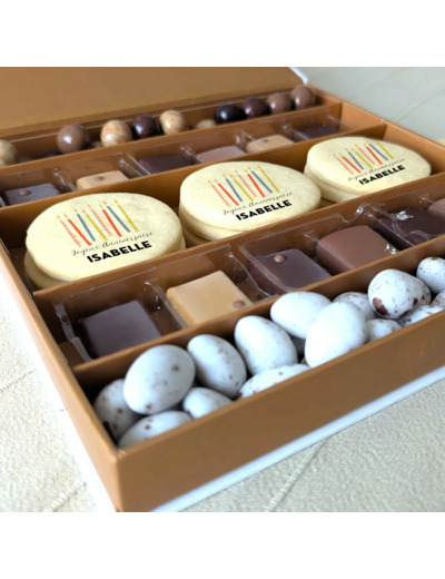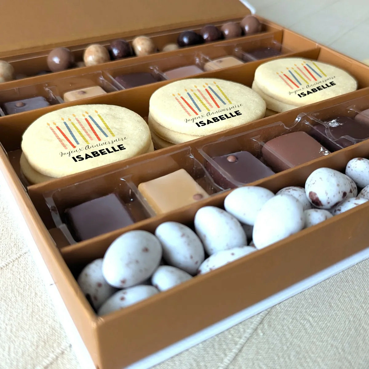 Envie d’un cadeau d’anniversaire original et personnalisé à offrir à un proche ? Le coffret L’Élégant est conçu pour les amateurs de très bons chocolats . Il réunit dans un bel écrin des sablés personnalisés, des pralinés Valrhona et des gourmandises croustillantes pour créer un coffret gourmand d’anniversaire prêt à offrir.