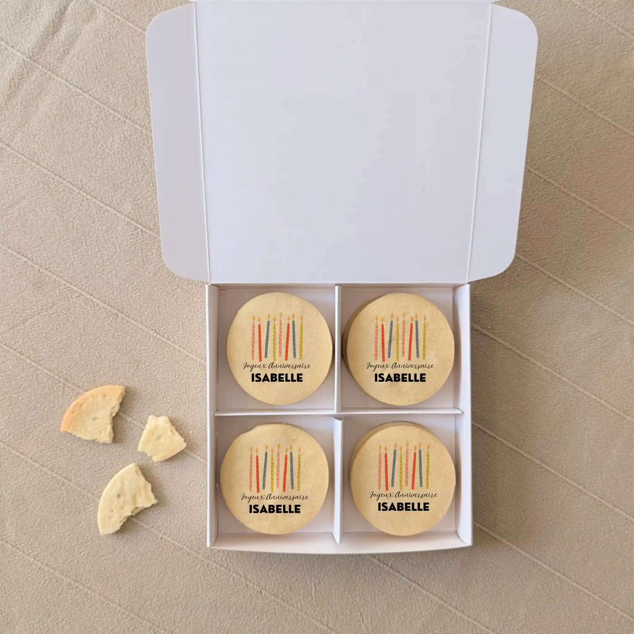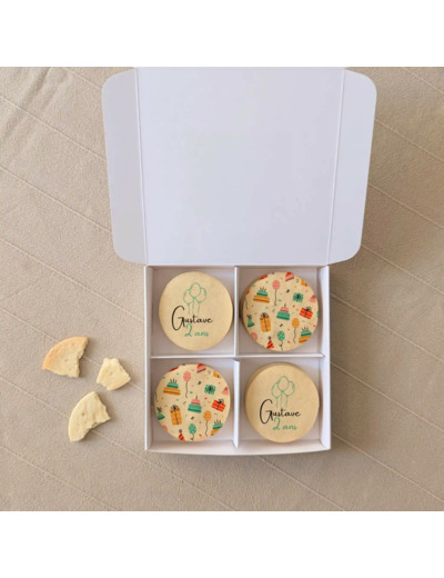 Personnalisez nos biscuits : ajoutez un prénom, un âge, un petit mot et choisissez un visuel parmi nos collections anniversaire (bougies, ballons, gâteaux, cocktails…). Résultat : un coffret élégant et 100 % personnalisé qui fera plaisir à coup sûr.