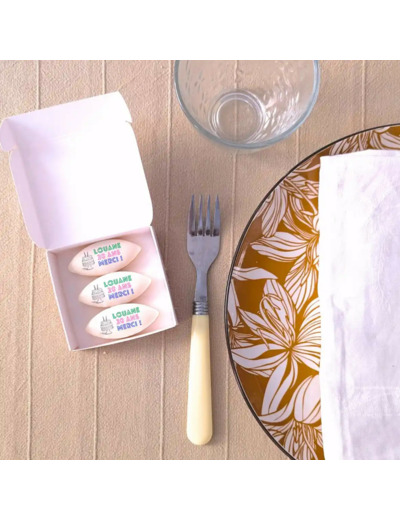 Si vous souhaitez que tous les calissons soient imprimés avec du texte sans que l’autre moitié soit imprimé avec le motif (valable pour “Ballons” ou “Cocktail”), merci de nous le préciser en commentaire de commande.