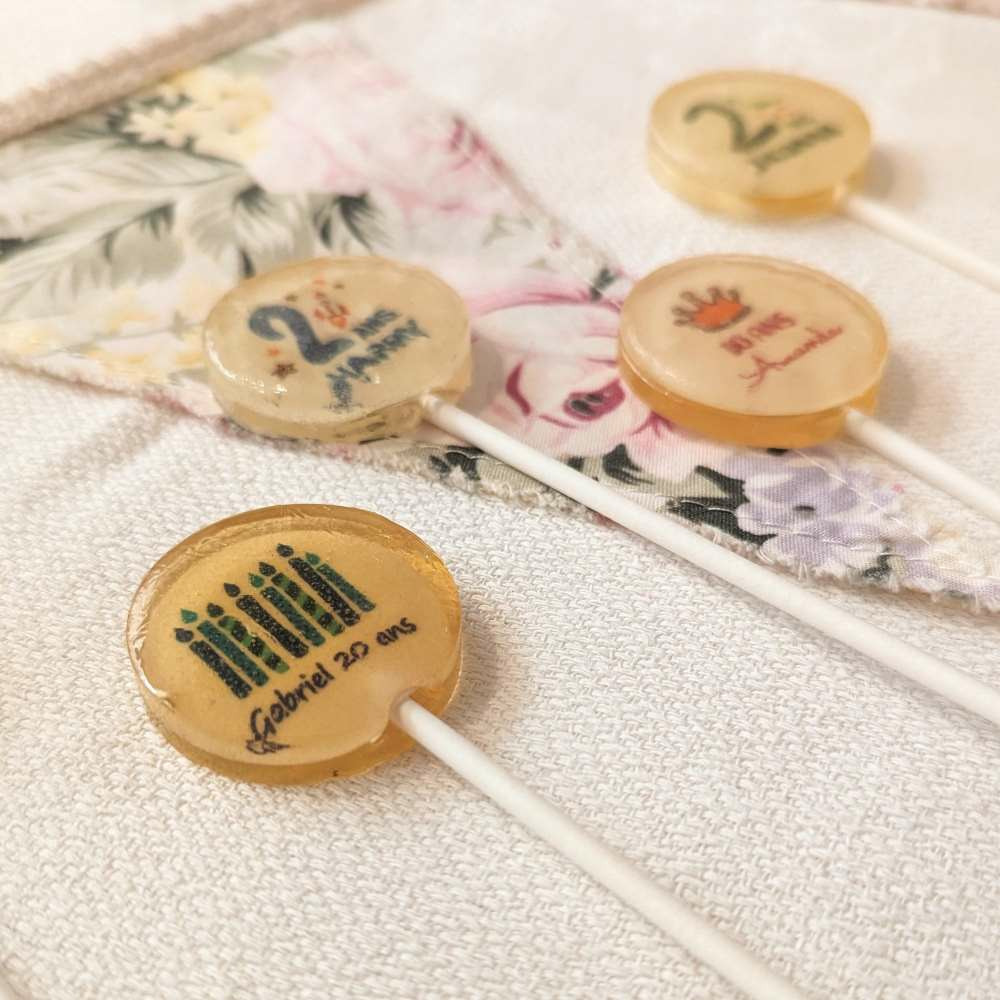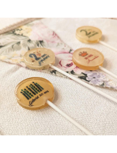 Nos petites sucettes en vrac font 3 cm de diamètre, elles sont disponible : à la coco, au citron, à la fraise et à la pomme. Les arômes sont naturels et fabriqués dans le sud de la France 🌿Une fine feuille de sucre est glissée à l'intérieur avec votre personnalisation.