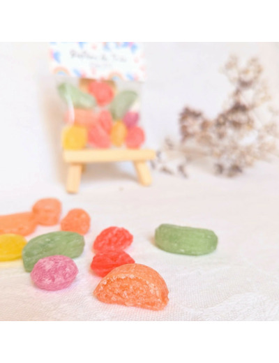 Nos sachets contiennent environs 10 pièces soit 36g de confiseries. Ces bonbons artisanaux, fabriqués en Provence, sont cuits dans des chaudrons en cuivre selon les méthodes traditionnelles. Sans colorants artificiels, ils séduisent autant par leur goût fruité que par leurs formes miniatures pleines de charme : fraise, cerise, citron, orange, melon et pomme verte. Chaque sachet contient un mélange de toutes les saveurs.
