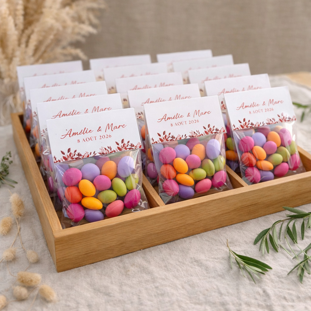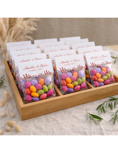 Notre sachet de dragées aux fruits est une alternative élégante et contemporaine. Grâce à leurs teintes mates et naturelles, ces dragées colorées apportent de la douceur et du caractère à votre table de réception. Un choix idéal pour un mariage bohème, champêtre ou moderne.