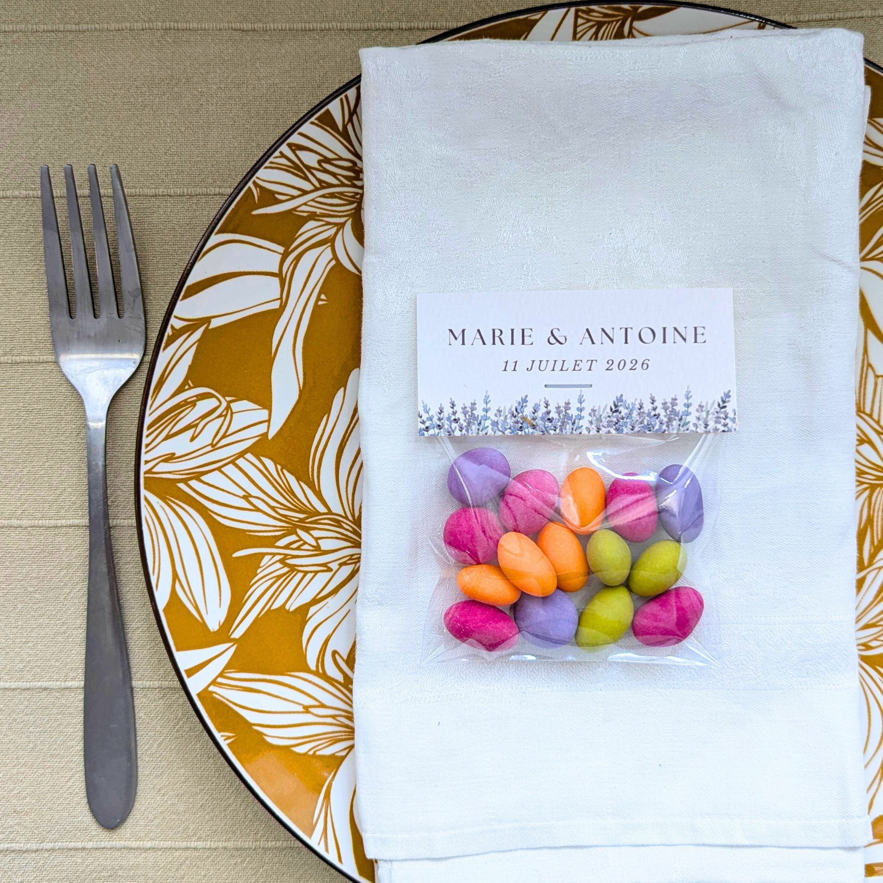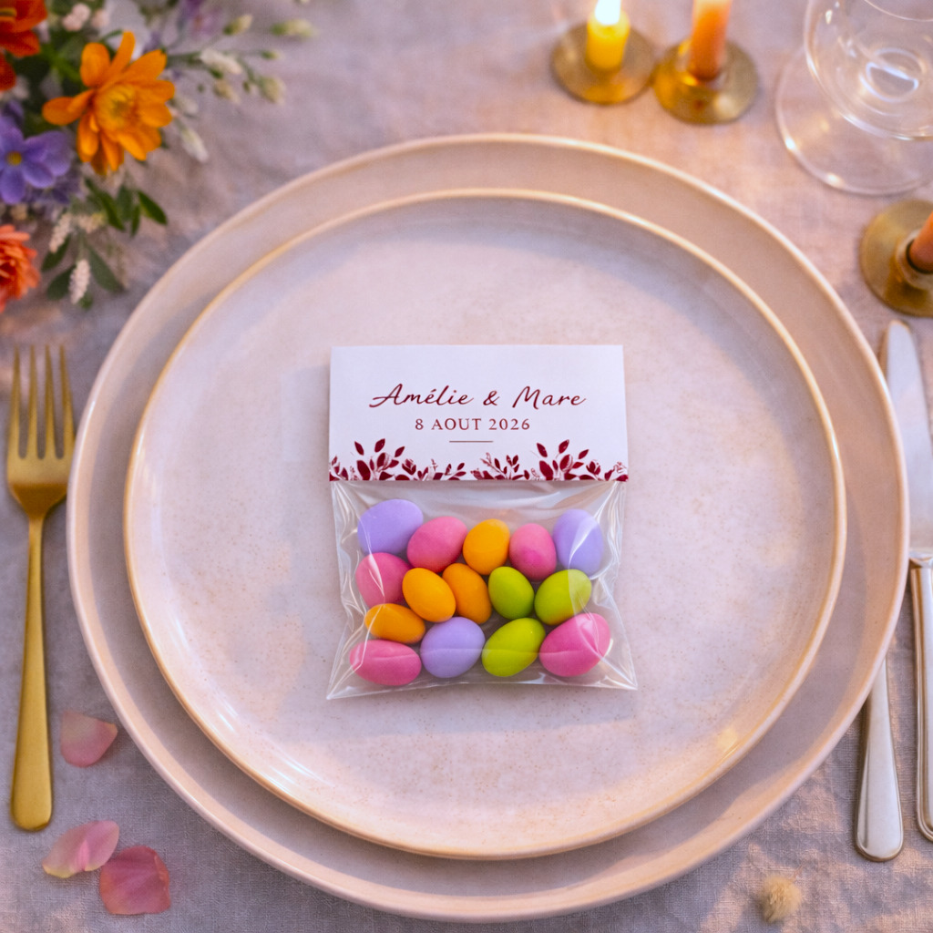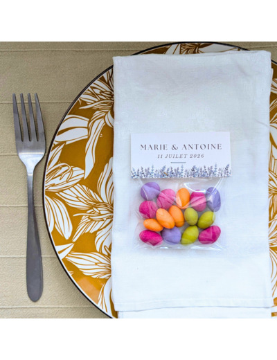 Vous obtenez ainsi un sachet de dragées mariage personnalisé, prêt à être disposé sur vos tables.