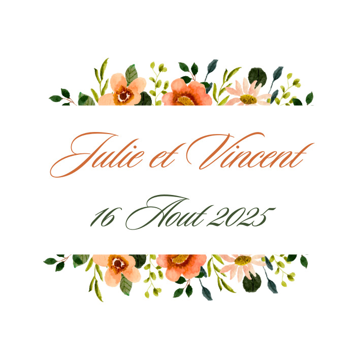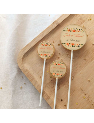 Le thème Floral est parfait pour un mariage naturel, champêtre et poétique. Associé à des bouquets de fleurs fraîches, des compositions végétales et une décoration lumineuse, il crée une atmosphère douce et harmonieuse. Nos sucettes personnalisées Floral s’intègrent idéalement dans une cérémonie printanière ou estivale, où la nature est au cœur de l’événement.