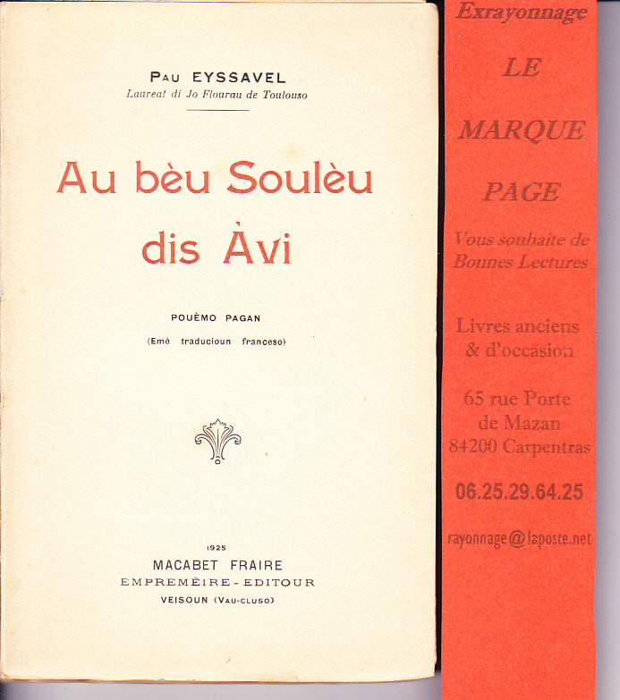 1925 , Macabet frères , Vaison , 201 pages . Ouvrage peu courant . Couverture TRES propre avec 2 coins pliés. Bas du dos écrasé recollé . Intérieur NEUF , non coupé . Les photos de références sont miennes . ATTENTION aucun envoi ne sera fait en lettre . SELECTIONNEZ IMPÉRATIVEMENT UN PORT PRÉPAYÉ (colis Relay , shop2shop , colissimo ), cela me permet un emballage plus soigné et évite les pertes . Retrait possible sur Carpentras