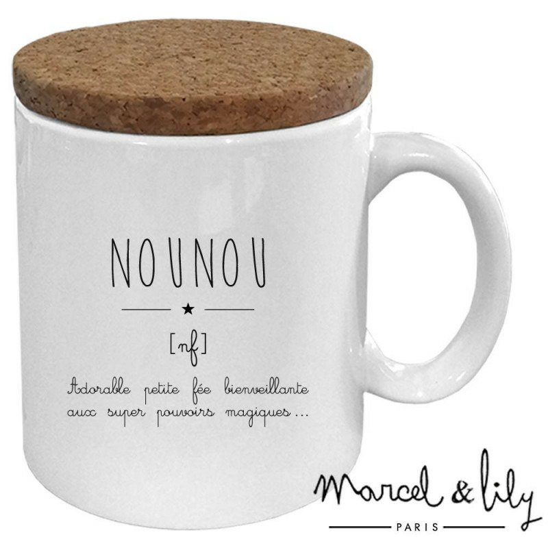 Mug en céramique "Nounou" avec son couvercle en liège 100% écologique et fabriqué dans le sud ouest de la France pour garder les boissons bien au chaud ou pour s'en servir de sous tasse.