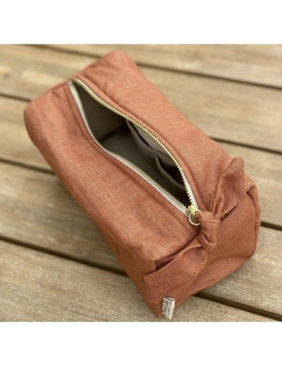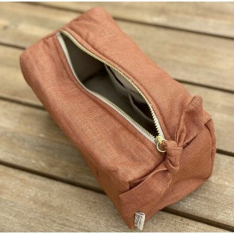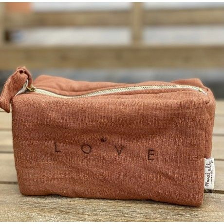 Nouvelle trousse en lin couleur cognac de forme rectangulaire avec sa jolie broderie LOVE pour y glisser tout votre joyeux bazar.
