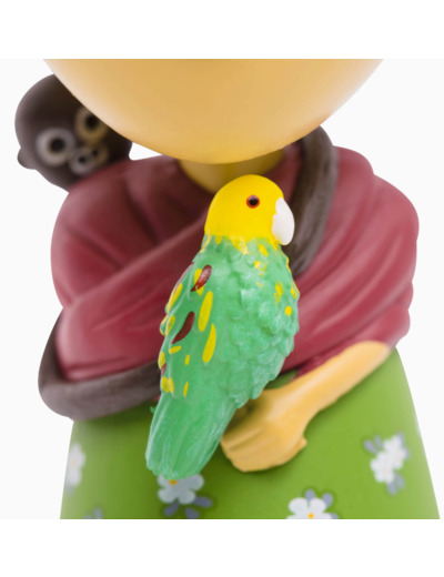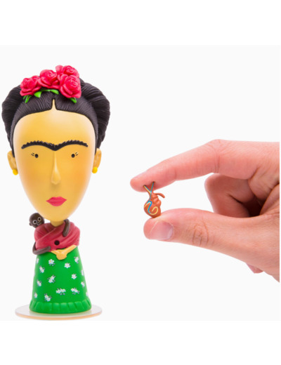 La figurine Frida Kahlo est livrée avec : Un parfum frais de rose sauvage (oui, vous avez bien lu). Un cœur surréaliste détachable. Un perroquet attachable. Un adorable singe sur son dos. 4 oeuvres inspirées par Frida kahlo et 1 chevalet en carton