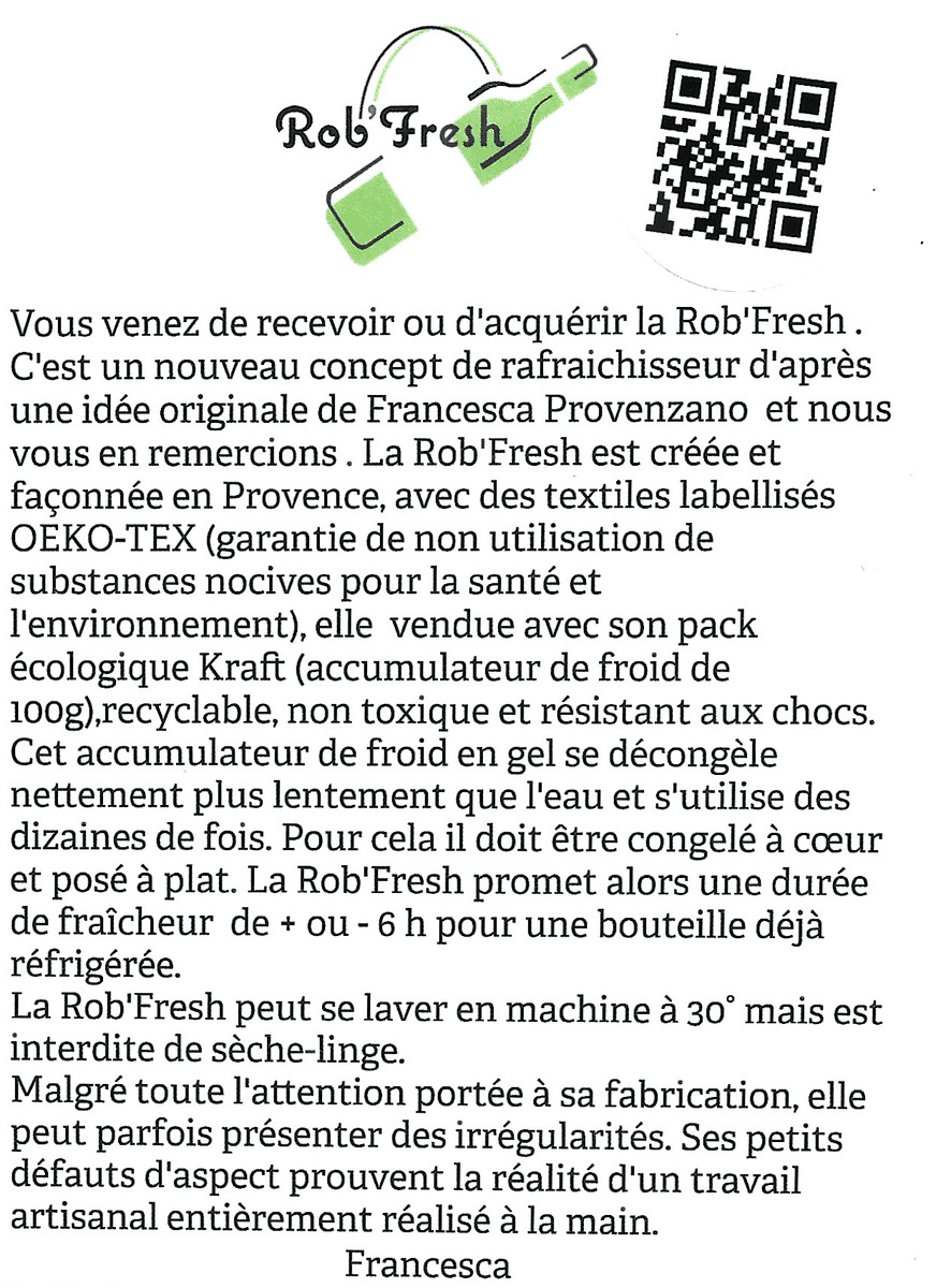 Le mot de l’équipe : Marque fondée par Francesca Provenzano qui a créé et fabriqué Rob'Fresh Tchin rafraîchisseur à boissons et Rob'Fresh Miam sacs isotherme pour les repas.