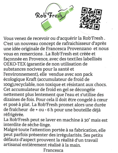 Le mot de l’équipe : Marque fondée par Francesca Provenzano qui a créé et fabriqué Rob'Fresh Tchin rafraîchisseur à boissons et Rob'Fresh Miam sacs isotherme pour les repas.