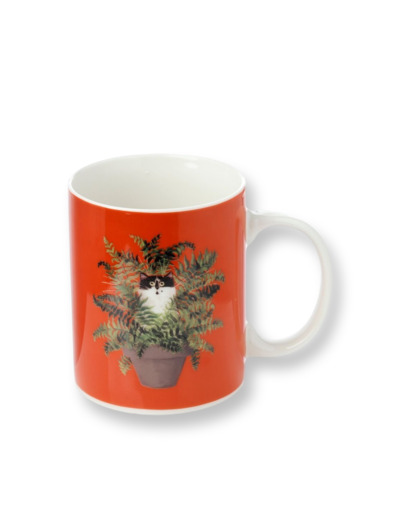 Design : Ce mug présente une illustration par l'artiste Kim Haskins, représentant un chat noir et blanc qui se cache derrière des fougères vertes dans un pot marron, créant un design ludique et enchanteur. L'intérieur du mug est blanc, contrastant avec son extérieur rouge vif.