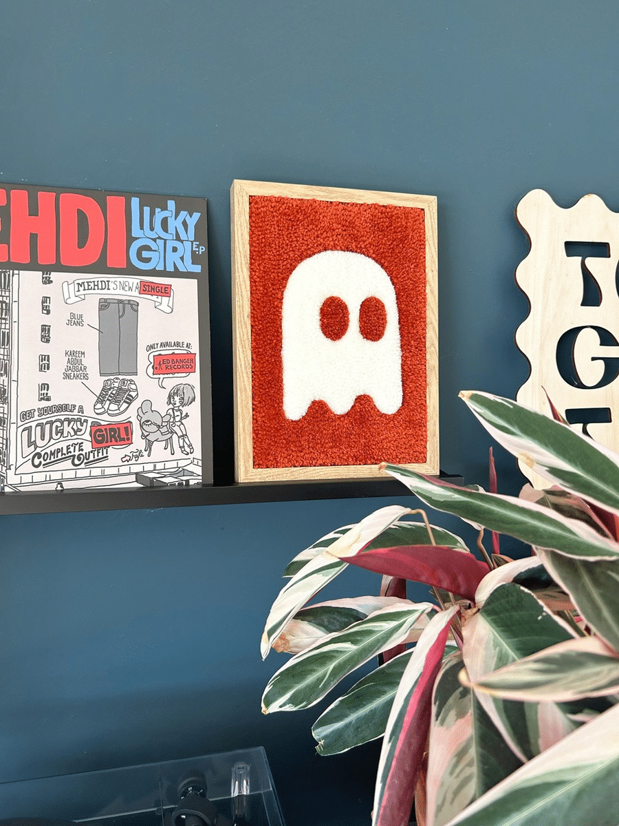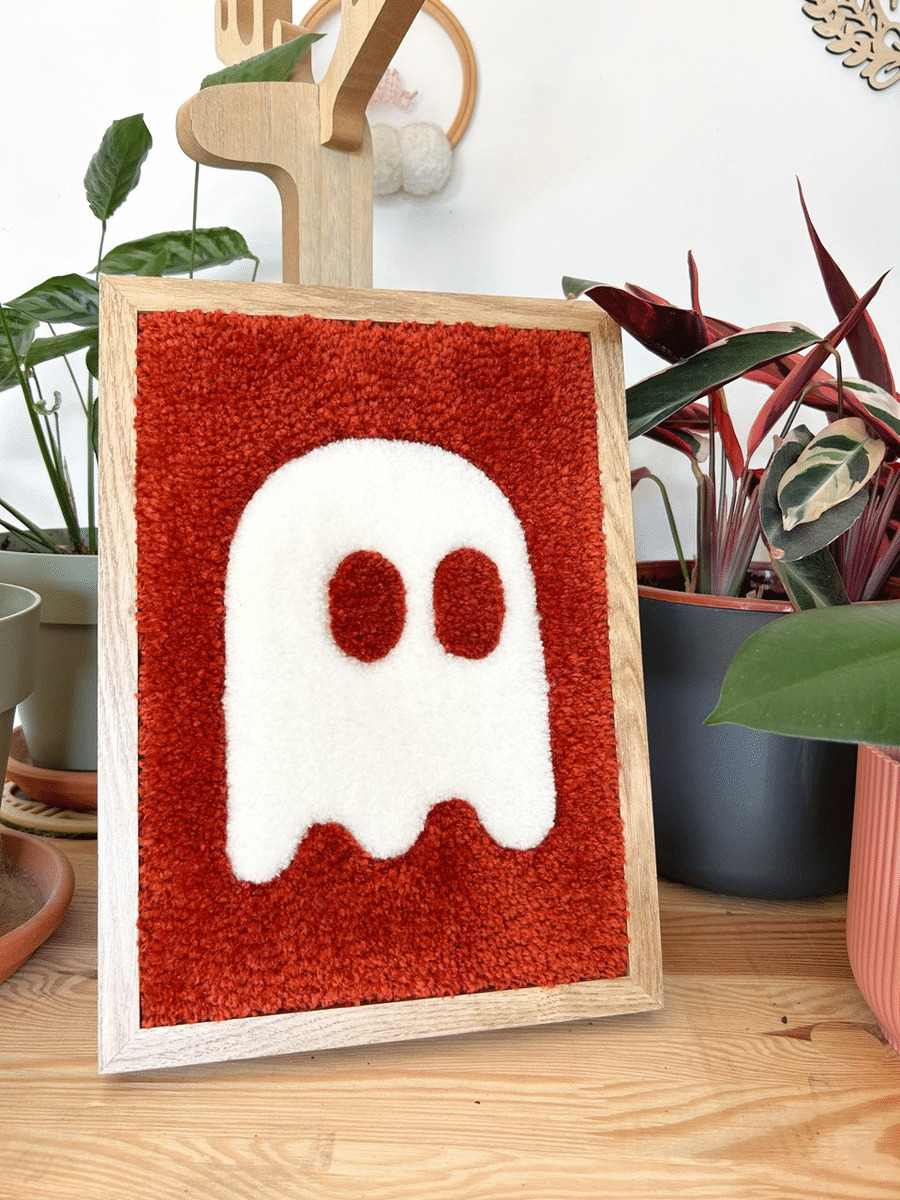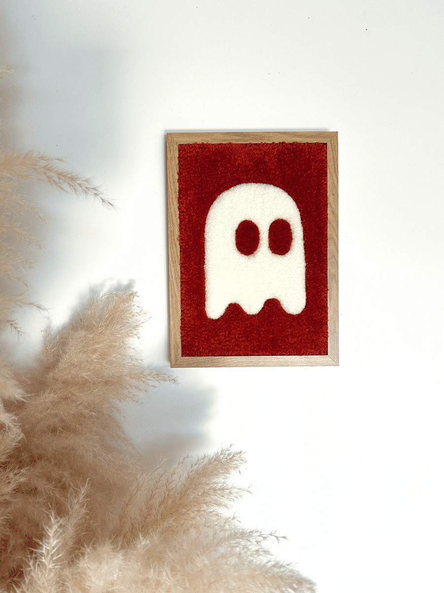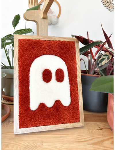 Cette création en tufting encadrée est parfaite pour insuffler une ambiance ludique à votre intérieur, mettant en scène un adorable petit fantôme minimaliste en couleur écru, évoluant sur un fond terracotta. Rappelant le personnage emblématique de Pac-Man, et minutieusement tufté à la main avec soin en Provence, dans le sud de la France